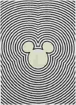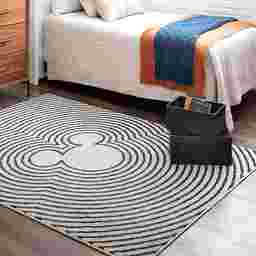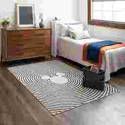 Daydream throughout the day and allow Disney Mickey Mouse's classic silhouette echo through your mind. The timeless design of Disney's Mickey Echo woven rug will be the centerpiece of any room in your home. The concentric navy and white pattern will surely catch the eyes of all friends who come to visit. Made in the USA and laser printed onto 100% recycled polyester with a non-skid latex backing, this area rug offers superior stain and fade resistant color clarity while maintaining a super soft feel, fixed shape, and precise placement. This rug is a smart choice for high-traffic areas and households with kids and pets. Customer assembly required.