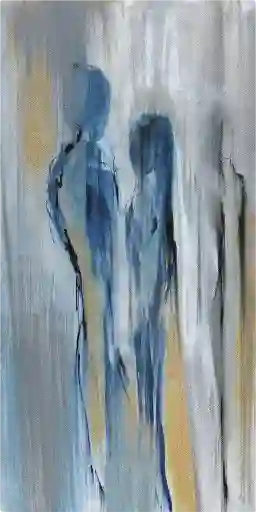 Add an artistic element to any interior space with the unique Distant Love artwork. This artwork features two figures in soft blends of blue and beige tones. This piece is a studio quality canvas that's gallery wrapped on solid wood stretcher bars.