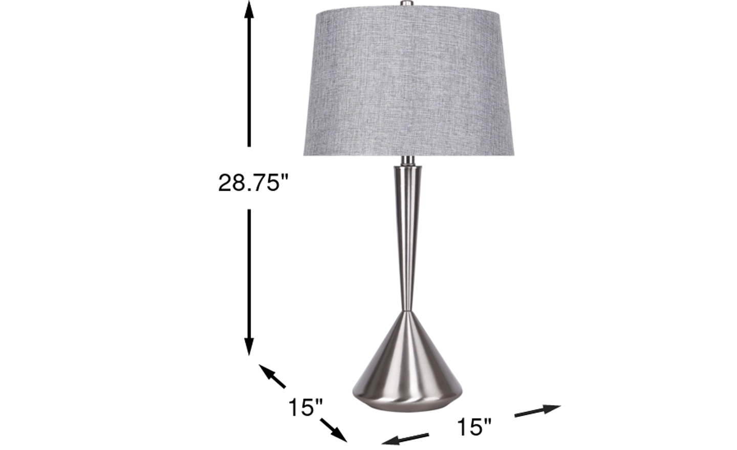 The Diva table lamps aren't just lighting; it's a full-on moment. With a sultry brushed nickel base that flares like a silver gown on a red carpet and a soft grey linen shade that diffuses light like a dream, each lamp in this two-piece set brings instant drama to any space. Whether perched on a nightstand, flanking a vanity, or making a scene in the foyer, the pieces elevate the space around them with ease. A three-way rotary switch turns each lamp on and off, while the max 60-watt bulb capacity punches up the possibility for ultra radiant light.