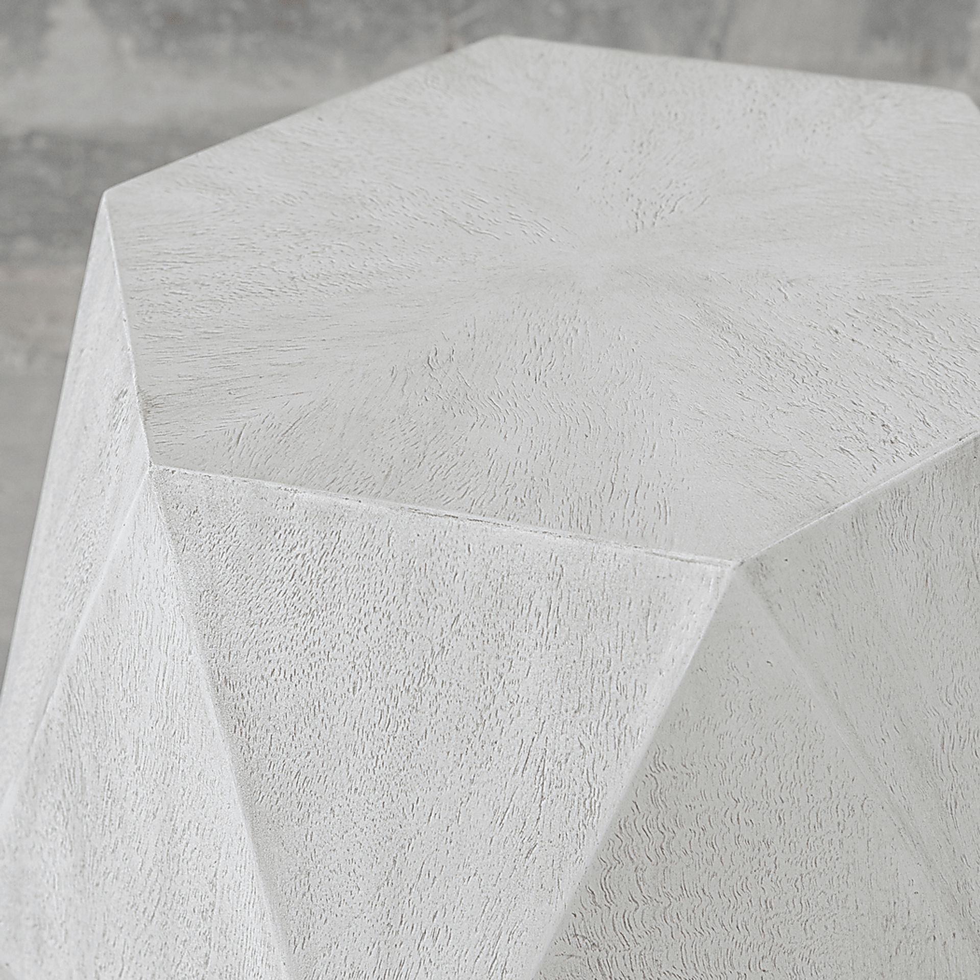 The Dodt is a unique geometric accent table that features a sunburst top in mango veneer with a worn white finish with natural distressing, rubbed to reveal honey undertones. Customer assembly is required.