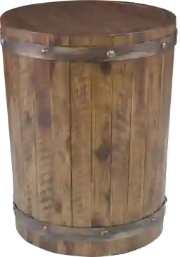The "wine barrel" design, complete with iron sheet metal strapping and riveted details, is highly versatile. It primarily complements contemporary and rustic decor, but it also serves as a striking focal point in industrial or modern farmhouse settings. The weathered walnut stain and burnished steel create a grounded, authentic look that pairs beautifully with neutral fabric upholstery or rich leather living room sets.