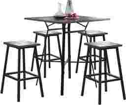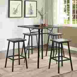 Looking for a fresh take on Industrial? The Dolvin oak 5 pc bar height dining set showcases the industrial look with updated angled legs and upper stretchers supporting a grooved weathered dark brown top. The combination of the black metal base and wood top gives it a warm look. The grooved wood theme is used on the stools as well which have angled out legs and full return foot rest for comfort and stability. Includes 1 Table and 4 Stools. Some customer assembly required.
