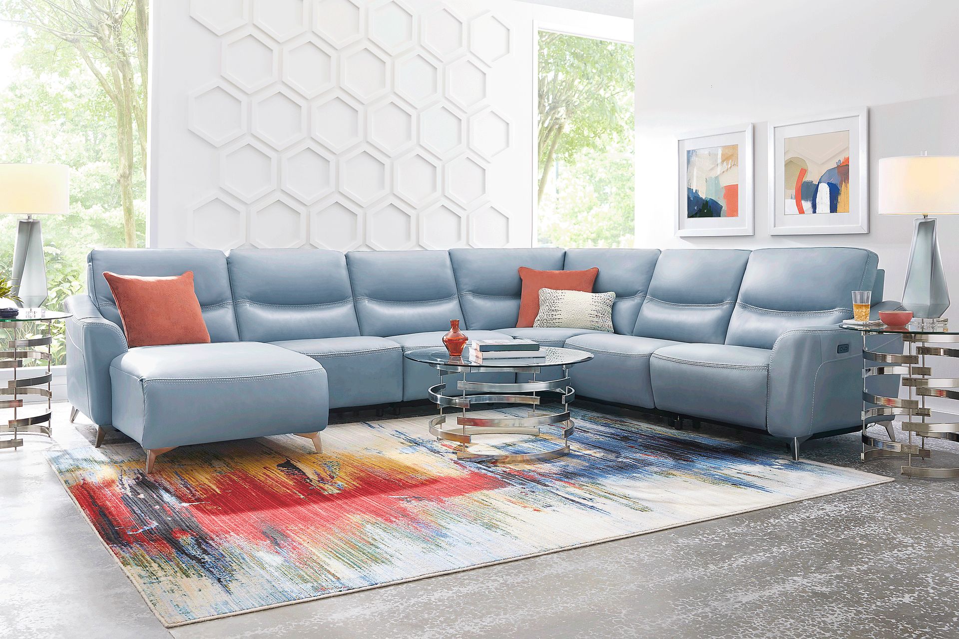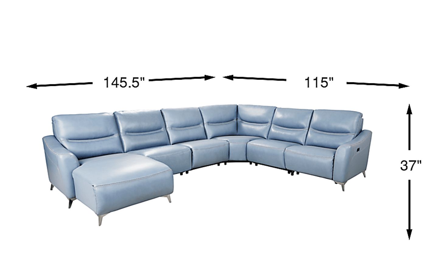 Whether you're hosting a casual movie night or throwing a glam cocktail party, the Domio sectional provides comfort, luxury and style. Its hydra colored leather upholstery where the body touches provides a comfortably supple surface for unwinding, and the convenient side USB port helps you to keep your devices on hand and charged. The sectional sits atop a set of gleaming angled chrome legs for contemporary appeal, while its flare arms create a chic silhouette. Its power reclining design allows you to stretch out, while moccasin stitching on the seats and arms provides a tailored finishing touch. Upholstery: Top grain leather where the body touches and vinyl sides and backs.
