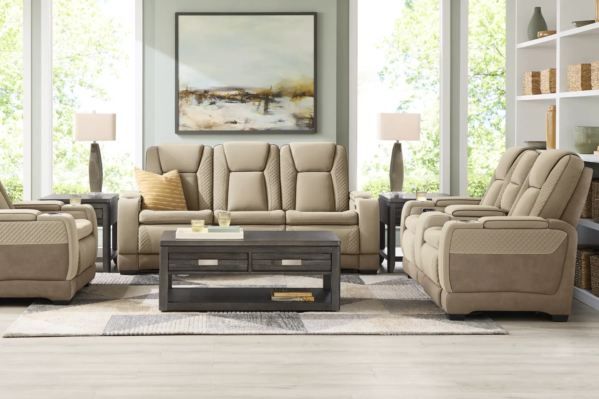 Upscale glamour in the casually cool Donovan Park living room brings a fresh and lively perspective to the art of everyday relaxation. This contemporary collection's soft beige upholstery showcases refined quilt stitching throughout the arms and seat backs, with welted seams for a tailored appearance. Dual power reclining seats include power adjustable headrests, footrests and a zero-gravity mechanism that positions the legs above the heart for superior pressure relief and a feeling of weightlessness. Built into each sleek track arm is a removable cupholder and hidden storage compartment, and each control panel also features USB-A and USB-C charging ports. The loveseat is also equipped with a center console, offering extra storage and hidden cupholders inside. For ultimate convenience, the sofa boasts a handy fold down table with cupholders, reading lights and wireless charging. Upholstery: 100% Polyester. Cleaning Instructions: Use water-based cleaning agents or foam. Accent pillow not included.