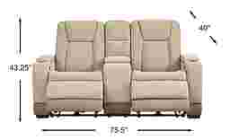 Upscale glamour in the casually cool Donovan Park loveseat brings a fresh and lively perspective to the art of everyday relaxation. This contemporary piece's soft beige upholstery showcases refined quilt stitching throughout the arms and seat backs, with welted seams for a tailored appearance. Dual power reclining seats include power adjustable headrests, footrests and a zero-gravity mechanism that positions the legs above the heart for superior pressure relief and a feeling of weightlessness. Built into each sleek track arm is a removable cupholder and hidden storage compartment, and the control panel also features USB-A and USB-C charging ports. For ultimate convenience, this loveseat boasts a handy center console with storage and hidden cupholders. Upholstery: 100% polyurethane.