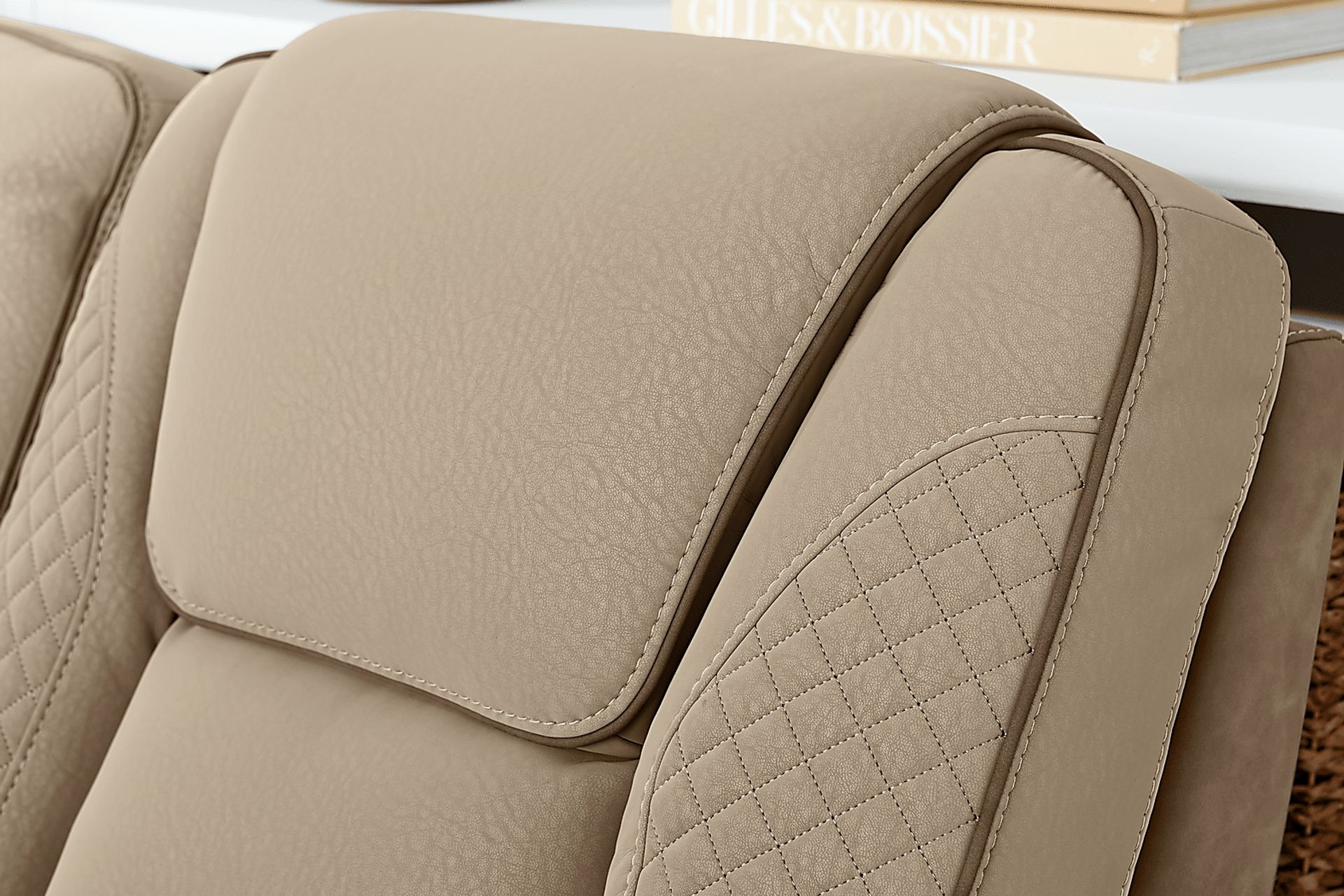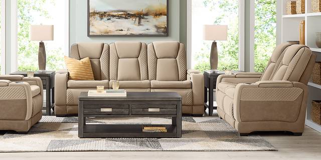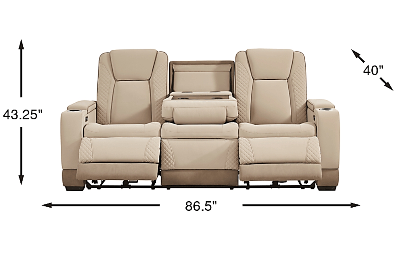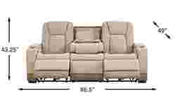 Upscale glamour in the casually cool Donovan Park sofa brings a fresh and lively perspective to the art of everyday relaxation. This contemporary piece's soft beige upholstery showcases refined quilt stitching throughout the arms and seat backs, with welted seams for a tailored appearance. Dual power reclining seats include power adjustable headrests, footrests and a zero-gravity mechanism that positions the legs above the heart for superior pressure relief and a feeling of weightlessness. Built into each sleek track arm is a removable cupholder and hidden storage compartment, and the control panel also features USB-A and USB-C charging ports. For ultimate convenience, this sofa boasts a handy fold down table with cupholders, reading lights and wireless charging. Upholstery: 100% polyurethane.