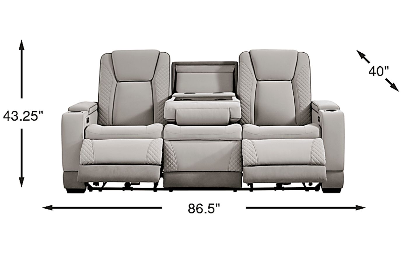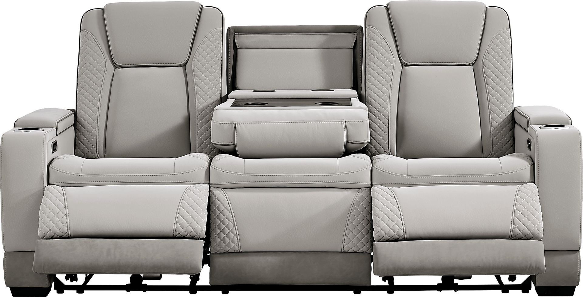 Upscale glamour in the casually cool Donovan Park sofa brings a fresh and lively perspective to the art of everyday relaxation. This contemporary piece's soft gray upholstery showcases refined quilt stitching throughout the arms and seat backs, with welted seams for a tailored appearance. Dual power reclining seats include power adjustable headrests, footrests and a zero-gravity mechanism that positions the legs above the heart for superior pressure relief and a feeling of weightlessness. Built into each sleek track arm is a removable cupholder and hidden storage compartment, and the control panel also features USB-A and USB-C charging ports. For ultimate convenience, this sofa boasts a handy fold down table with cupholders, reading lights and wireless charging. Upholstery: 100% polyurethane.