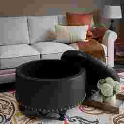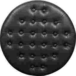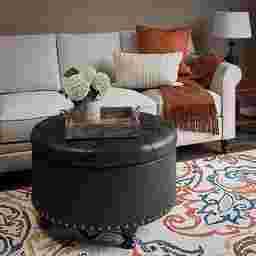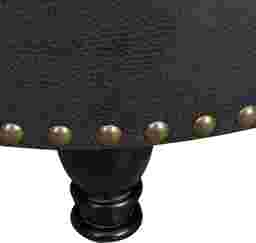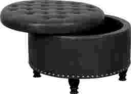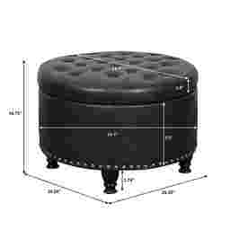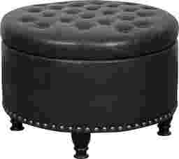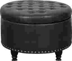 A comfortable seat, an inviting footrest, convenient storage this versatile round Doretta ottoman is a welcoming addition to any room of the home. The top is dotted with color match button tufting and stitched accents, lifting away to expose a roomy storage interior ideal for a lap blanket, media remotes, and more. The fully turned wooden legs feature a black lacquer look finish that pops against the matte leather like surface and aged brass nail head trim above. A fashionable twist on the classic storage ottoman, this plush upholstered upgrade is the ideal finishing touch for a living room, den, or study. Customer assembly is required.