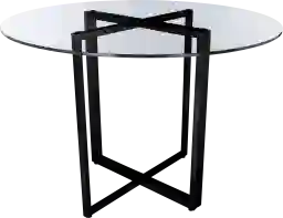 The Dorsky black dining table pairs the flexible base with a round clear tempered glass top. Adjustable feet provide stability.