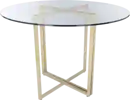 The Dorsky gold dining table pairs the flexible base with a round clear tempered glass top. Adjustable feet provide stability.