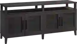 The Drogheda black console accommodates up to a 65-inch TV weighing 95 pounds or less. Hidden storage behind doors with decorative rattan inserts. Two adjustable shelves provide flexible storage options. Large open shelf for additional storage of electronics or home decor items. Enclosed back with pass-throughs for cord management. Customer assembly is required.