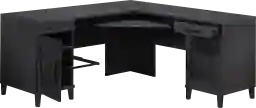 Slide-out keyboard or mouse shelf can be placed on the left or angled in the corner in the Drogheda black L-desk. Two storage drawers feature full extension slides. Hidden storage behind each door features an adjustable shelf and pull-out hanging storage with full extension slides that accommodate letter or legal-size hanging files. Door fronts feature rattan insert for added style. Impact resistant, high-grade thermoplastic edges for enhanced durability. Cord management system includes two desktop grommets and cord pass-throughs. Finished on all sides for versatile placement in the home. Meets BIFMA standard for safety, durability, and structural performance. Customer assembly is required.