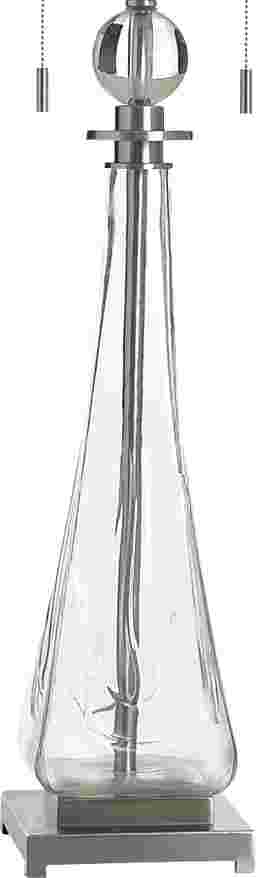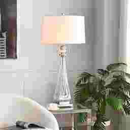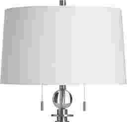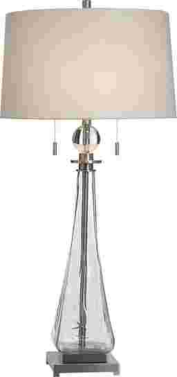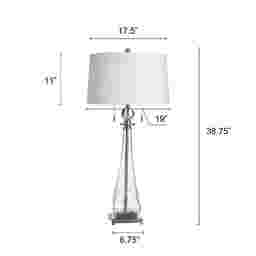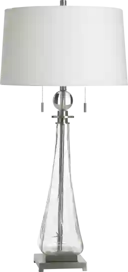 The Duja Clear Lamp is a vision of modern elegance, designed to bring lightness and sophistication to any space. Its elongated, clear glass base flows like liquid crystal, creating an airy silhouette that feels both delicate and refined. A polished metal frame and a perfectly balanced square pedestal add a touch of contemporary glamour, while the crisp white drum shade casts a soft, ambient glow that transforms your room into a serene retreat. Complete with dual pull chains for effortless charm, this lamp is more than lighting-it's a statement of grace and style. Partial assembly may be required.