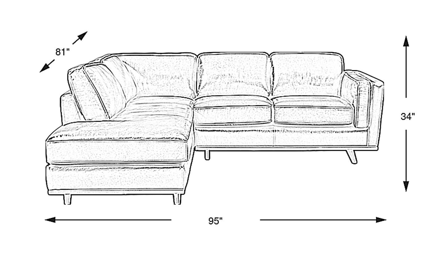 Yes, with a width of 95 inches and a depth of 81 inches, this sectional is an excellent choice for smaller homes, condos, or apartments. Its contemporary, low-profile design (34 inches high) and tall tapered legs create an "airy" feel that makes a room appear more spacious rather than cramped. The two-piece configuration also makes it easier to navigate through standard doorways and hallways during delivery compared to larger, multi-piece sets.