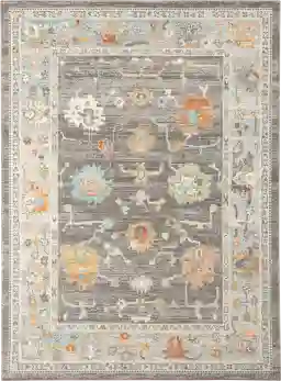 This rug features a sophisticated floral pattern with a boho-chic feel and a palette including orange, taupe, and light blue, making it a versatile centerpiece for transitional spaces. At 5'1" x 7'6", it is an ideal scale for grounding a small seating area, a home office, or placing under a bistro table. To maintain a balanced and professional look in your layout, we recommend leaving approximately 18 inches of bare floor between the rug edges and the walls.