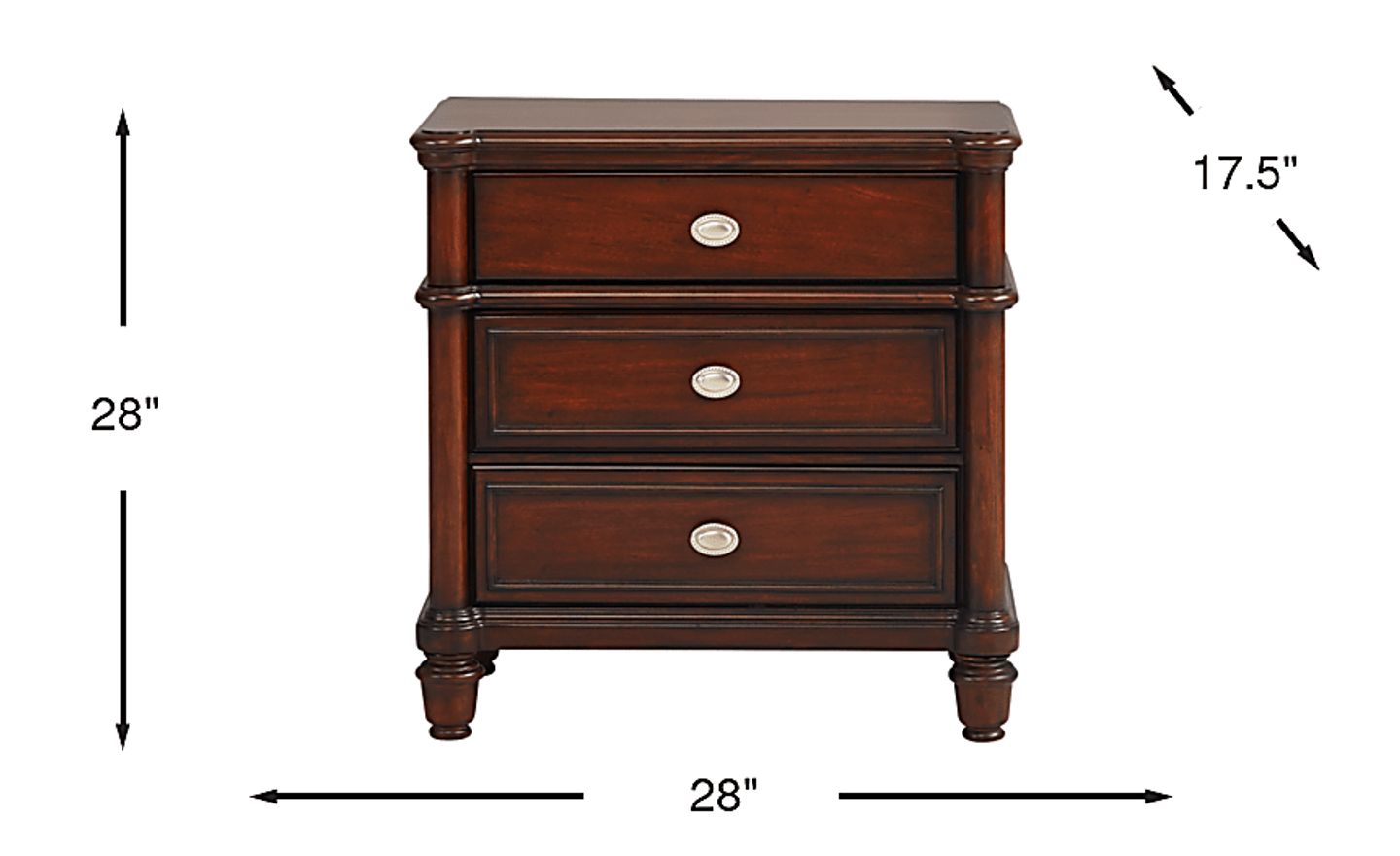Keep books, magazines and a glass of water close at hand with the Durrington nightstand. Crafted of mahogany wood solids and veneers in a rich brown cherry finish, this piece is great for bedside storage thanks to its three spacious drawers. Moulding detail and metal hardware pulls complete this stylish nightstand to match the rest of the collection.