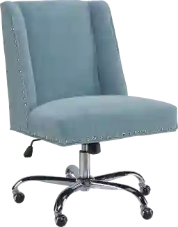 Add style and function to your office with the Dutson desk chair. The soft, plush frame is upholstered in an aqua fabric and features a square back. Silver nailheads accent the chair. A chrome base has metal casters for ease of mobility. Perfect for a home work space or the office. Customer assembly is required.
