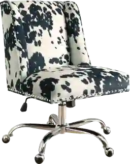 This chair serves as a sophisticated statement piece that bridges the gap between modern and eclectic styles. The black and white cow print fabric and silver nailhead trim pair exceptionally well with minimalist desks or industrial decor. To create a cohesive executive feel, we recommend coordinating the chrome base with other metallic accents in your workspace, such as a silver desk lamp or metal shelving units.
