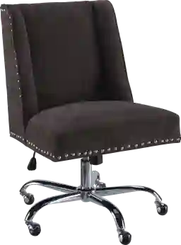Add style and function to your office with the Dutson desk chair. The soft, plush frame is upholstered in a charcoal fabric and features a square back. Silver nailheads accent the chair. A chrome base has metal casters for ease of mobility. Perfect for a home work space or the office. Customer assembly is required.