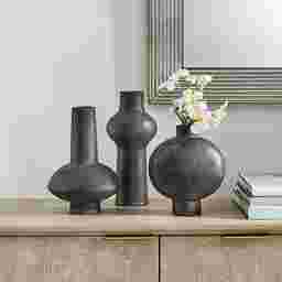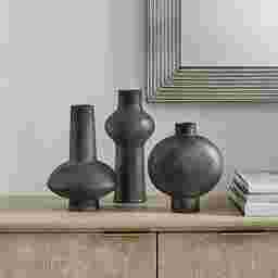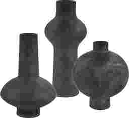 This striking trio of Dyliane ceramic vases features a distressed black finish with subtle dark bronze undertones, giving each piece a unique, worn-in character. Their minimalist, modern forms make them a versatile addition to a space, whether displayed together as a set or individually. Safe for outdoor use, but protection from freezing temperatures is recommended. Sizes: S-8x9x4, M-8x11x8, L-6x12x4