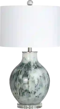 The Eakin View lamp is crafted of blown glass with a reverse painted effect in a beautiful dripped glaze of blue and white. The color scheme is peaceful and serene and the crystal base adds just the right touch of sparkle. Partial assembly may be required.