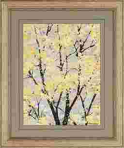 Contemporary spring branches framed under glass with a single mat accented with a grooved cut exposing a black core. Frame has a washed gold finish with ribbed embossing.