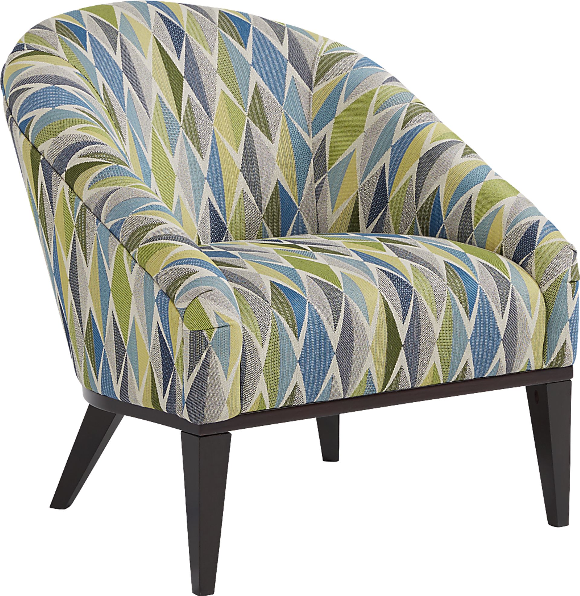 Inspired by mid-century design, the East Side agler blue accent chair provides a striking contemporary aesthetic. Upholstered with soft fabric and a contemporary pattern in blue, green and gray, this piece features a curved back and wood base with artfully angled legs in a brown finish. Upholstery: 68% Polyester, 23% Rayon, 9% Linen