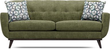 Featuring mid-century design with a bohemian touch, the East Side sofa is unforgettable. Upholstered with soft chenille fabric in avocado, this sofa features a distinct tailored style for a must-have retro look. An expansive tufted back and wood base with artfully angled legs in a brown finish add to the vintage appeal. Gorgeous accent pillows with a colorful geometric pattern included. 100% Polyester