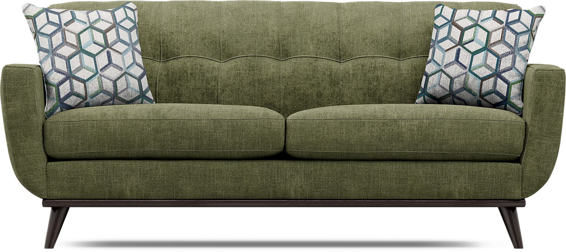 With a laid-back mid-century modern design, the East Side apartment sofa offers a refreshing update to your living room. Upholstered with soft chenille fabric in avocado, this piece features a distinct tailored style for a must-have retro look. Scaled for smaller spaces, a tufted back and wood base with artfully angled legs in a brown finish add to the vintage appeal. Gorgeous accent pillows with a colorful geometric pattern included. 100% Polyester