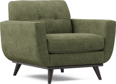 This sofa captures a classic mid-century modern aesthetic through several tailored details. Key elements include the expansive button-tufted backrest, the clean-lined wood base, and the artfully angled, tapered legs in a rich brown finish. These features, combined with the bold avocado green hue, provide a sophisticated retro-bohemian vibe that serves as a stylish focal point for contemporary interiors.