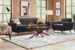 Featuring mid-century design with a bohemian touch, the East Side living room is unforgettable. Upholstered with soft chenille fabric in black, this collection features a distinct tailored style for a must-have retro look. Tufted back and wood base with artfully angled legs in a brown finish add to the vintage appeal. Gorgeous toss pillows with a tasteful geometric pattern coordinate with the accent chair to complete the look. Upholstery: 100% Polyester. Cleaning Instructions: Use water based cleaning agents or foam. Small accent pillow not included.