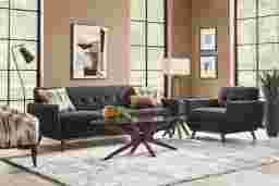 The tufted back and tapered legs of the East Side Black Sofa are key design elements that offer both aesthetic appeal and practical advantages. The tufted back provides a refined, tailored look inspired by mid-century modern design, adding texture and visual interest while helping the back cushions maintain their shape. The artfully angled tapered legs, crafted from wood, elevate the sofa, contributing to its bohemian feel and creating an open, airy silhouette that can make a room appear more spacious.