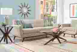 Featuring mid-century design with a bohemian touch, the East Side living room is unforgettable. Upholstered with soft chenille fabric in mushroom, this collection features a distinct tailored style for a must-have retro look. Tufted backs and wood bases with artfully angled legs in a brown finish add to the vintage appeal. Gorgeous accent pillows with a colorful geometric pattern included. Upholstery: 100% Polyester. Cleaning Instructions: Use water based cleaning agents or foam. Small blue accent pillow not included.
