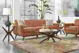 Featuring mid-century design with a bohemian touch, the East Side sofa is unforgettable. Upholstered with soft chenille fabric in russet orange, this sofa features a distinct tailored style for a must-have retro look. An expansive tufted back and wood base with artfully angled legs in a brown finish add to the vintage appeal. Gorgeous accent pillows with a colorful geometric pattern included. Upholstery: 100% Polyester