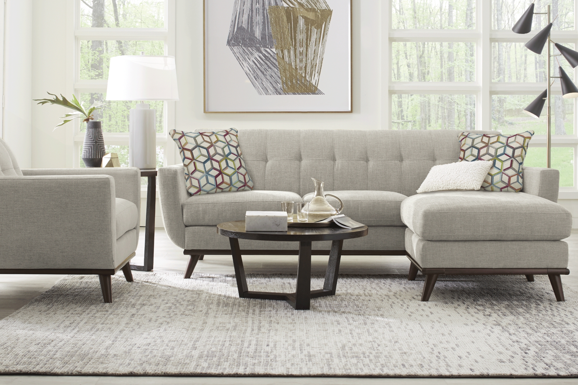 Featuring mid-century design with a bohemian touch, the East Side chaise sofa is unforgettable. Upholstered with soft chenille fabric in sand, this piece features a distinct tailored style for a must-have retro look. Its chaise sofa design provides room to recline, while an expansive tufted back and wood base with artfully angled legs in a brown finish add to the vintage appeal. The reversible chaise can float to either end of the sofa's frame by simply flipping its seat cushion. Gorgeous accent pillows with a colorful geometric pattern included. Upholstery: 100% Polyester.