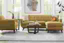 Featuring mid-century design with a bohemian touch, the East Side chaise sofa is unforgettable. Upholstered with soft chenille fabric in sunflower yellow, this piece features a distinct tailored style for a must-have retro look. Its chaise sofa design provides room to recline, while an expansive tufted back and wood base with artfully angled legs in a brown finish add to the vintage appeal. The reversible chaise can be floated to either end of the sofa's frame by simply flipping its seat cushion. Gorgeous accent pillows with a contemporary chevron pattern included. 100% Polyester
