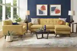 Featuring mid-century design with a bohemian touch, the East Side sectional living room is unforgettable. Upholstered with soft chenille fabric in sunflower yellow, this collection features a distinct tailored style for a must-have retro look. Tufted back and wood base with artfully angled legs in a brown finish add to the vintage appeal. The reversible chaise can be oriented to either end of the sofa's frame by swapping the seat cushions. Gorgeous accent pillows with a colorful geometric pattern included. Upholstery: 100% Polyester. Cleaning Instructions: Use water based cleaning agents or foam. Small accent pillow not included. Tables and lamp not as shown in room image.