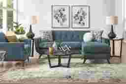 Featuring mid-century design with a bohemian touch, the East Side chaise sofa is unforgettable. Upholstered with soft chenille fabric in a teal color, this piece features a distinct tailored style for a must-have retro look. Its chaise sofa design provides room to recline, while an expansive tufted back and wood base with artfully angled legs in a brown finish add to the vintage appeal. The reversible chaise can be floated to either end of the sofa's frame by simply flipping its seat cushion. Gorgeous accent pillows with a contemporary chevron pattern included. 100% Polyester