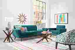 Featuring mid-century design with a bohemian touch, the East Side living room is unforgettable. Upholstered with soft chenille fabric in teal, this collection features a distinct tailored style for a must-have retro look. Tufted backs and wood bases with artfully angled legs in a brown finish add to the vintage appeal. Gorgeous accent pillows with a colorful geometric pattern included. Upholstery: 100% Polyester. Cleaning Instructions: Use water based cleaning agents or foam. Small accent pillow not included. Tables and lamps not as shown in room image.