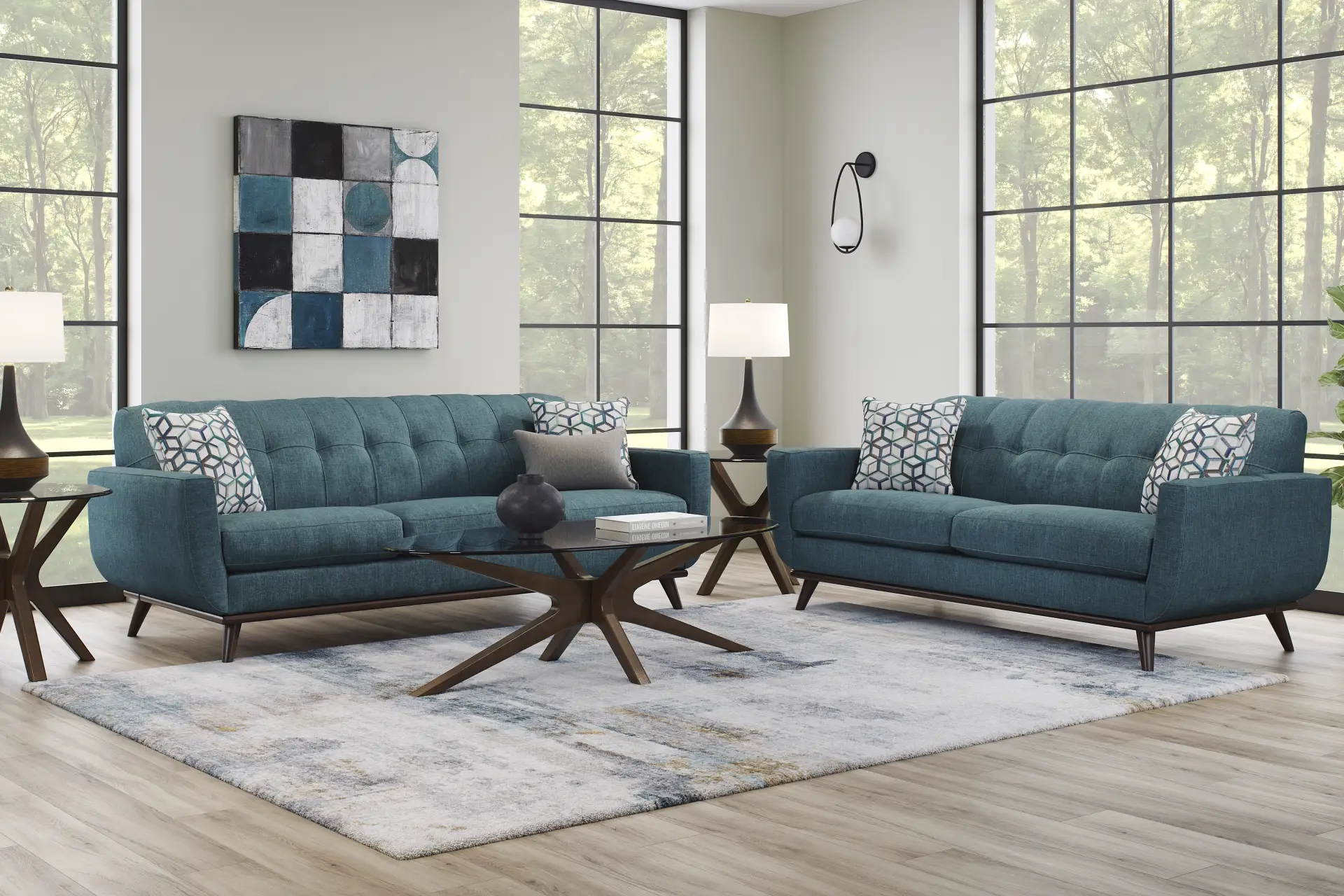 Featuring mid-century design with a bohemian touch, the East Side living room is unforgettable. Upholstered with soft chenille fabric in teal, this collection features a distinct tailored style for a must-have retro look. Tufted backs and wood bases with artfully angled legs in a brown finish add to the vintage appeal. Gorgeous accent pillows with a colorful geometric pattern included. Upholstery: 100% Polyester. Cleaning Instructions: Use water based cleaning agents or foam. Tables and lamps not as shown in room image. Small accent pillow not included.