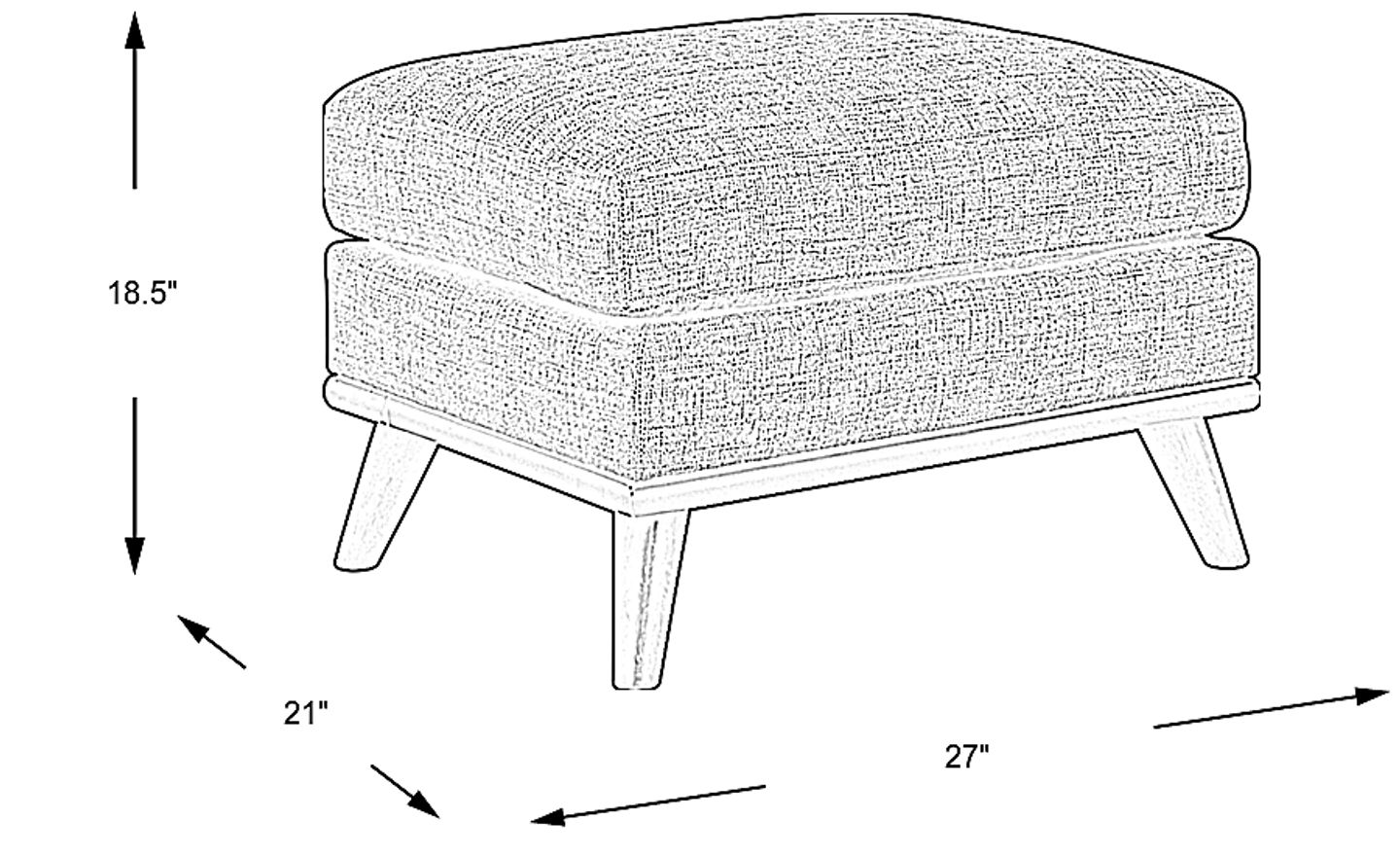For a balanced look, your ottoman should ideally be about two-thirds the length of your sofa and sit at a height that is equal to or slightly lower than your sofa's seat cushions. Measuring 27"w x 21"d x 18.5"h, this rectangular ottoman is designed at a standard height that allows it to align seamlessly with most contemporary sofa seats, providing an ergonomic and comfortable resting place for your feet.