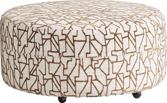 Offering traditional style with contemporary touches, the East Village cocktail ottoman imbues any space with unique flair. Upholstered with plush woven chenille in sandstone, the ottoman features a modern accent pattern with copper and beige tones. Whether you need an extra seat or a flat surface to rest your feet, this ottoman's round shape provides a myriad of uses for you to enjoy. Upholstery: 100% Polyester