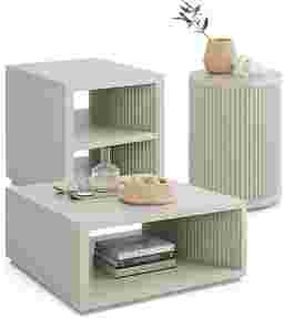 Whether displaying classic literature, a warm cup of tea or a frame that holds a cherished memory, the Eastchester table set welcomes it all with understated confidence and sculptural grace. Contemporary in style, these accents are crafted of cherry veneers in a smooth white finish with sleek frames and confident silhouettes. Open bottom shelves provide ample display space, showcasing subtly curved ribbed interiors that add dimension and visual interest. The plinth base grounds each piece with a refined touch while complementing the structured forms in this collection.