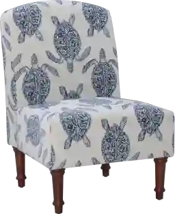 Transform your reading nook or living room with the Eastchill cozy accent chair, perfect for a modern coastal theme. The whimsical turtle print in indigo and cream hues adorns a snug polyester and cotton blend over plush cushions. Supported by a sturdy wooden frame with turned wood legs in a gray wash stain, this chair effortlessly blends modernity with a traditional touch. Its armless design ensures an easy fit in corners and tight spaces, providing both style and comfort to any setting. Customer assembly required.