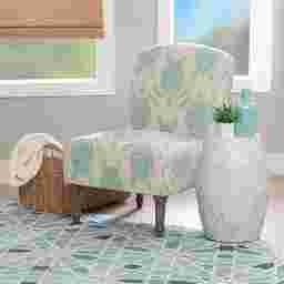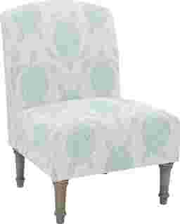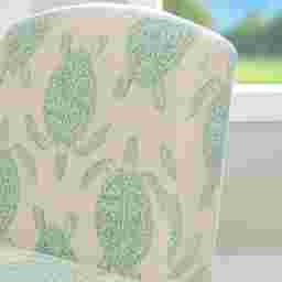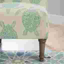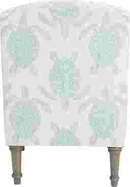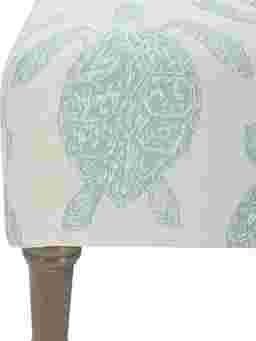 Transform your reading nook or living room with the Eastchill cozy accent chair, perfect for a modern coastal theme. The whimsical turtle print in indigo and cream hues adorns a snug polyester and cotton blend over plush cushions. Supported by a sturdy wooden frame with turned wood legs in a gray wash stain, this chair effortlessly blends modernity with a traditional touch. Its armless design ensures an easy fit in corners and tight spaces, providing both style and comfort to any setting. Customer assembly required.