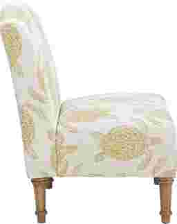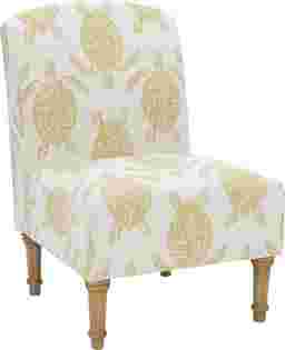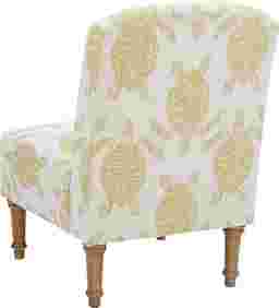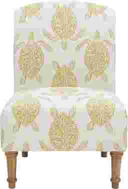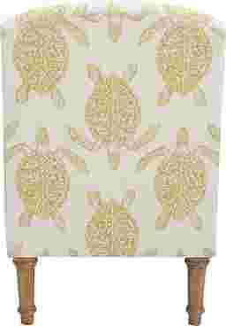 Transform your reading nook or living room with the Eastchill cozy accent chair, perfect for a modern coastal theme. The whimsical turtle print in indigo and cream hues adorns a snug polyester and cotton blend over plush cushions. Supported by a sturdy wooden frame with turned wood legs in a gray wash stain, this chair effortlessly blends modernity with a traditional touch. Its armless design ensures an easy fit in corners and tight spaces, providing both style and comfort to any setting. Customer assembly required.