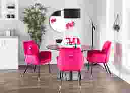 Invite the bold and modern style of the Easterlyn side chair into your home. A classic design is angled for a contemporary update and dressed in your choice of available velvet upholstery colors. Featuring chrome accents, the Easterlyn sits on slim tapered metal legs. Customer assembly is required.