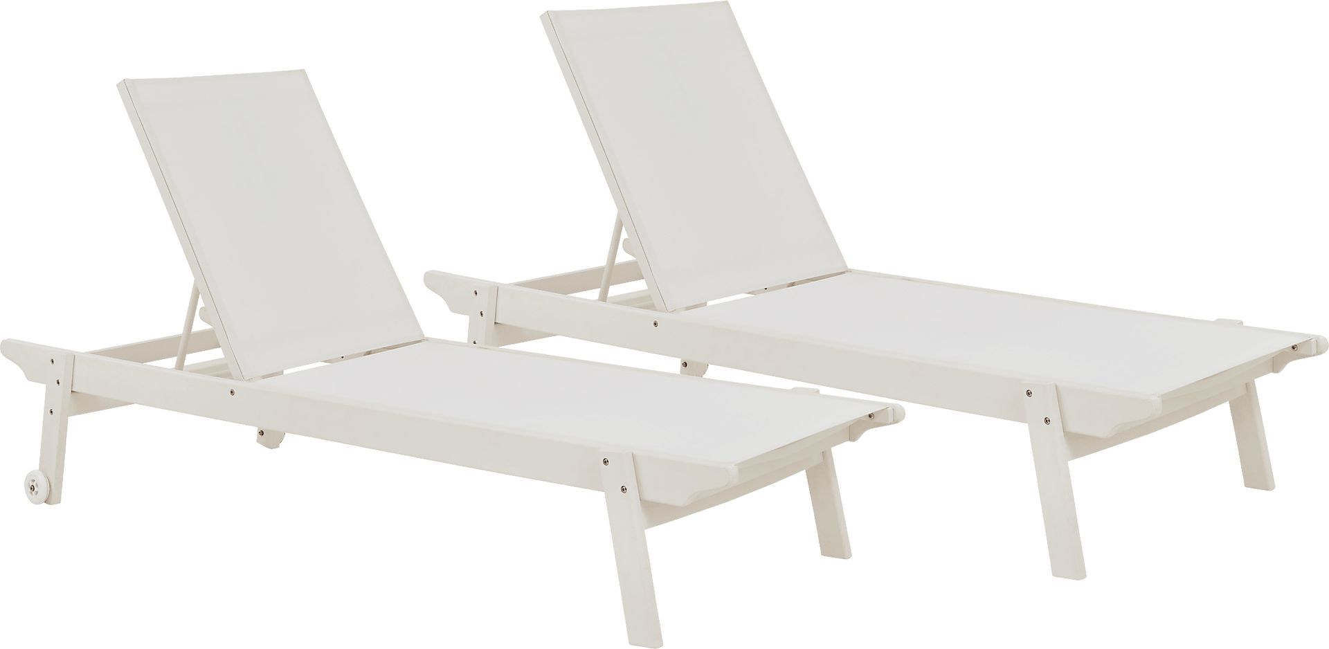 Enhance your outdoor seating accommodations with the modern Eastlake chaise set. Crafted from highly durable materials, this set of two armless chaises feature white sling seats. Back wheels offer easy movement anywhere: patio, poolside, or otherwise. The vibrant and versatile white finish makes styling and accenting easy with outdoor accent pillows, towels and more.