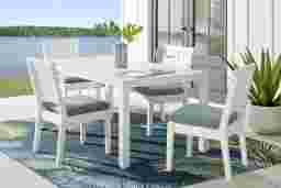 Enhance your patio with the modern Eastlake dining set. Featuring a 71" rectangle table and four slat-back side chairs with breezy blue-green outdoor cushions, this set is crafted from highly durable outdoor materials in a white finish for easy enjoyment for years to come. An umbrella hole in the center can be capped when not in use.