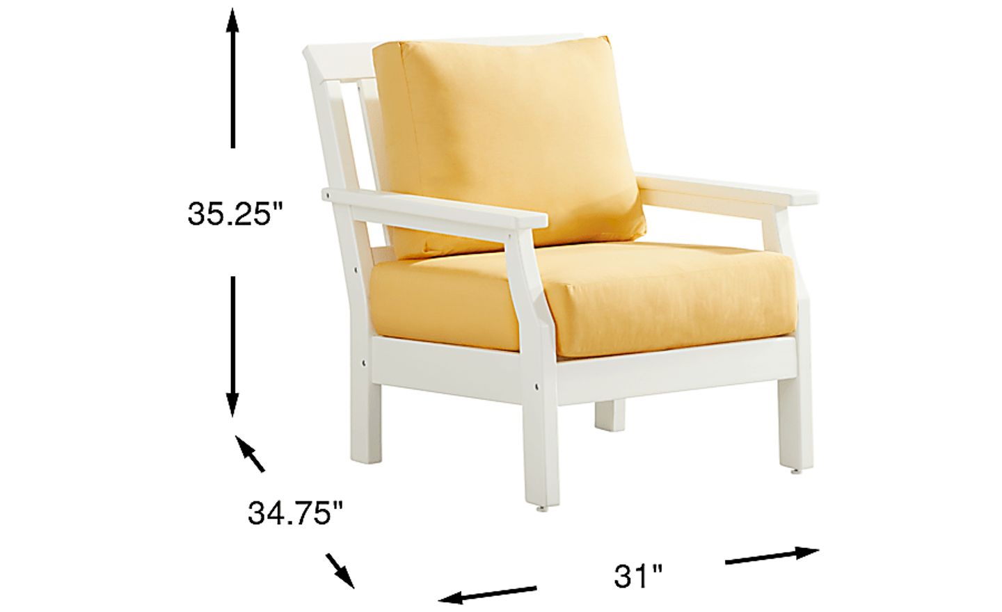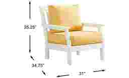 Enhance your outdoor living space's seating accommodations with the modern Eastlake club chair. Crafted from highly durable materials, this chair features a slat back and clean lines for a classic silhouette. Bright buttercup yellow seat cushions in colorfast Sunbrella fabric offset the outdoor chair's versatile white finish, offering ample comfort and style to enjoy for years to come. To clean Sunbrella fabric cushions remove dirt and spray on cleaning solution (water and mild soap), then use a soft bristle brush or sponge. Allow cleaning solution to soak into fabric and rinse thoroughly until soap residue is removed. Air dry. Do not dry clean.
